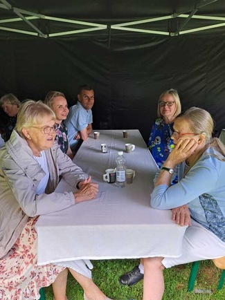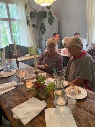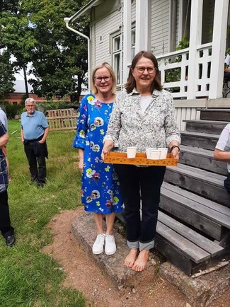 Ennen lounasta teimme bussilla kiertoajelun Nuppolan kylän ympäri ja kävimme läheisessä Multialan kartanossa. Kartanon omistaja Heidi Hautala kertoi meille asumisestaan Multialassa ja mittavasta ja työläästä päärakennuksen peruskorjauksesta. Hän esitteli kartanon puistoa ja saimme maistaa talon omaa omenamehua. Paikka on ollut Nuppolan kyläläisille merkityksellinen: 1800-luvulla ja 1900-luvun alkupuolella kartanossa oli palveluksessa monia Nuppolan suvun nuoria. Ryhmämme jäsenillä oli paljon kartanoon liittyviä kertomuksia ja omakohtaisia muistoja. Yhteinen kesäpäivä oli onnistunut ja siitä jäi hyvä muisto.