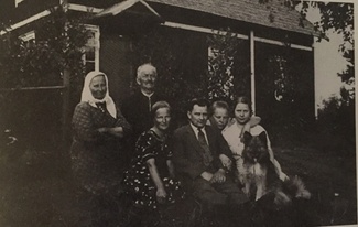 ![]() Ahomäen vanhan mökin pihalla. Takana vas. Mari Nuppola (s.1870), Matti Nuppola (s.1869), Ida Nuppola, Edvard Nuppola, Elina Nuppola ja Edvardin puoliso Aino |